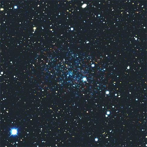Eridanus II is a dwarf galaxy located in the constellation Eridanus. Discovered in 2014, it is one of the faintest and smallest satellite galaxies orbiting the Milky Way. With an estimated distance of approximately 370,000 light-years from Earth, Eridanus II is a relatively distant galactic neighbor. It has a low luminosity, with an absolute magnitude of about -7, making it significantly dimmer than many other known dwarf galaxies. Its faintness and remote location made its detection challenging. Eridanus II's properties, such as its size, luminosity, and distance, place it among the ultra-faint dwarf galaxies, a class of small, diffuse stellar systems found in the outskirts of the Milky Way.